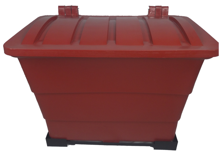 Lixeira/Contêiner/Contentor fabricado através de processo de rotomoldagem, em polietileno de média densidade (PEAD), utilizando material reciclável (produto sustentável), com capacidade volumétrica de 500 Litros ou 350 Kg. Contém um aditivo extra com antioxidante e anti-UV para os níveis de proteção classe 8-UV8 (ASTM - American Society for Testing and Materials). Equipado suporte de aço carbono com pintura epoxi com furo para parafusar no chão.Com dreno para escoamento de líquidos.
